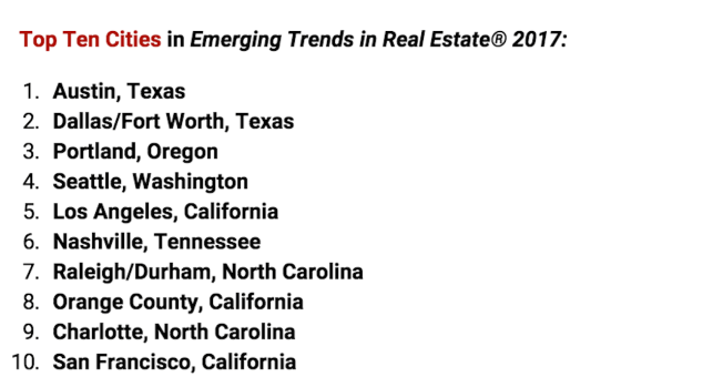 “Viewed as a fluke when it hit the study’s top-ten list five years ago, Austin’s rise to the top of the list signals the durability of the city’s long-term appeal to investors,” says Mitch Roschelle, PwC partner and real estate research leader. “Austin, along with many of this year’s top-ten cities, boasts attractive, niche neighborhoods and a vibrant, diverse economy.”