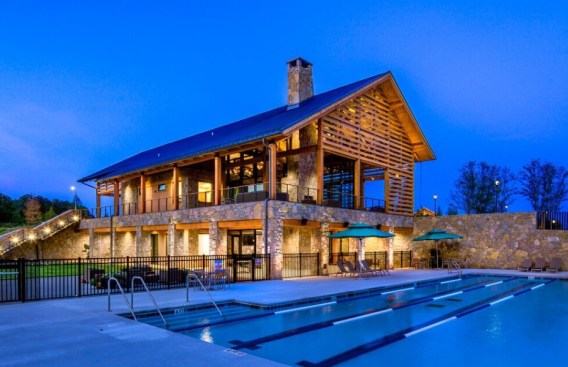 The Farmhouse at Wendell Falls blends innovative design with the area’s agrarian heritage, showcasing a rustic ambience and on-site features like a historic tobacco barn and barn quilt. The green-built space includes a lakeside pavilion, event lawn, state-of-the-art pool, fitness facility, kids room, custom playground, and an on-site café.