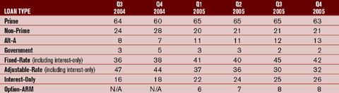 In just two years, interest-only loans, which defer principal payments for a set number of years, went from relative obscurity to accounting for 26 percent of all loans by dollar volume in the fourth quarter of 2005, according to the Mortgage Bankers Association (MBA). Option-ARMs, which allow borrowers to pay little or no principal and even a minimal amount of interest (with unpaid interest added to the principal at the borrower’s option), accounted for 8 percent of the market by dollar volume. Adjustable-rate loans (not including interest-only loans, which are generally adjustable) accounted for more than a third of all loans issued last year.