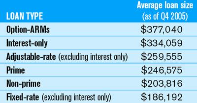 Interest-only loans, and especially option-ARMs, are nearly twice as large on average compared with 30-year fixed-rate loans, according to MBA data for 2005. A study by Christopher Cagan, director of research and analytics for First American Real Estate Solutions, finds that adjustable rate borrowers have substantially less equity in their homes, which is explained in part by the fact that these borrowers as a group purchased their homes more recently.