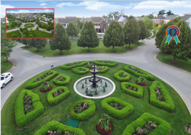The traffic circle in the Village of West Clay features a well-landscaped roundabout with a fountain in the center of manicured hedges. It sits in the middle of Jackson Circle, one of the many visual amenities in the village, which was designed and built by Brenwick Development.