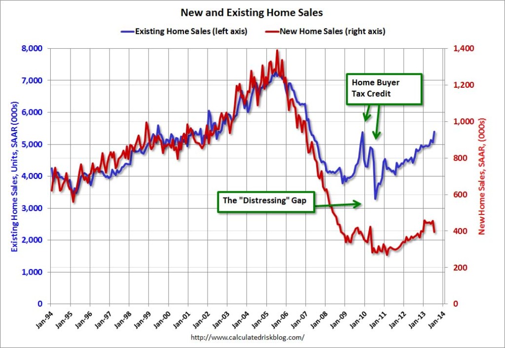 So, yes, interest rates very likely had an impact on the fact that on an not-annualized basis, new home sales fell to their lowest monthly total since December 2012 (but still were 7% higher on a not-annualized basis than in July 2012).