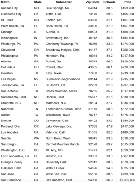 For the second consecutive year, Blue Springs, Mo., a suburb of Kansas City, topped HomeUnion’s list with a median home price of $159,700. Zip codes in Oklahoma City and St. Louis placed second and third, respectively in the rankings.