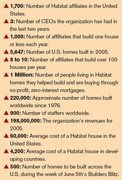 Among them sat Kevin Campbell of Habitat for Humanity, the Americus, Ga.-based non-profit organization that, despite ranking as the nation’s third largest private home builder, holds a unique position among the balance sheet-focused bunch. That distinction aside, as national director for the 2006 Home Builders Blitz program set to build 500 homes in conjunction with builder partners across the United States the week of June 5th through 9th, Campbell is certainly no stranger to challenges of the industry.