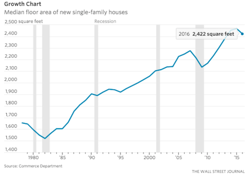 Here’s a story from Wall Street Journal staffer Jeffrey Sparshott (paywall) citing recently released housing characteristics data from the Census Bureau that indicates that after quantum leaps upward in square footage since the recession began, home sizes actually shrunk a bit–2%–in 2016.