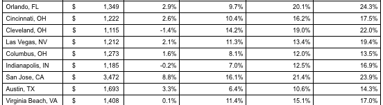 The median rent in the U.S. is $1,389 per month. Zillow forecasts rents to increase about 3% during the next 12 months to a Zillow Rent Indexiii of $1,426.
