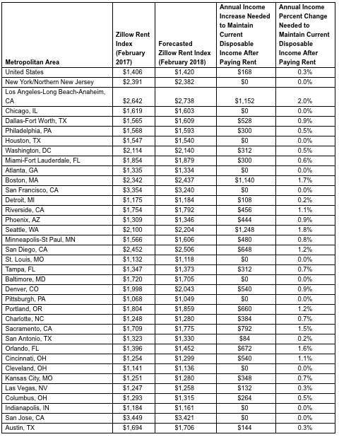 Nationally, annual incomes would need to rise just $168 for renters to keep up with rising rents in the next year alone – an increase that comes on top of nearly five years of rising rents putting a dent in paychecks across the country.