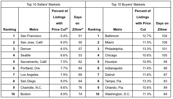 To determine which markets favor buyers and sellers, Zillow looked at the length of time a home stays on the market and the percentage of listings with a price cut. In buyers’ markets, homes are on the market longer and price cuts occur more frequently. Homes in a sellers’ market sell quickly and have fewer homes with a price cut.