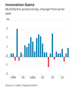 Multifactor productivity grew 1% last year, the strongest gain since 2010, the first full year of the expansion, the Labor Department said Wednesday. Multifactor productivity measures the improvement in U.S. output after accounting for any additions to capital and labor. It is a rough measure of innovation—how much more companies are able to produce by coming up with better ways to use existing resources, rather than by adding more workers or machines.