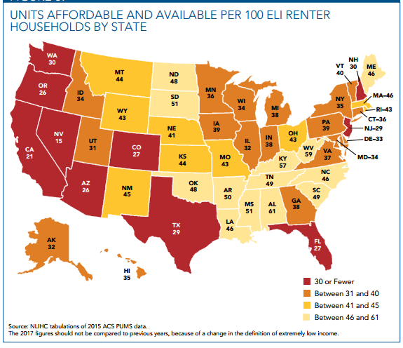 The report, based on 2015 American Community Survey data, presents the availability of affordable homes for renter households in each state, the District of Columbia, and the 50 largest metropolitan areas. ELI renter households face a shortage of affordable and available rental homes in every state. The supply ranges from 15 affordable and available homes for every 100 ELI renter households in Nevada to 61 in Alabama. After Nevada, the states where ELI renters face the greatest challenges finding affordable homes are California (21 affordable and available rental homes for every 100 ELI renter households), Arizona (26 for every 100 ELI renter households), Oregon (26 for every 100 ELI renter households), Colorado (27 for every 100 ELI renter households), and Florida (27 for every 100 ELI renter households). The affordable housing shortage for ELI households ranges from 8,700 rental homes in Wyoming to 1.1 million in California.