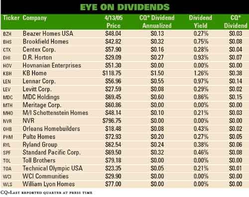 Although most builders have a dividend policy by nowāand some are increasing their dividends on a regular basisāādividends in the home building industry are still de minimis both in terms of amount and yield,ā Murray says. Builders historically have not paid dividends, and the initiation of dividend policies is a relatively recent development in the industry, he notes.