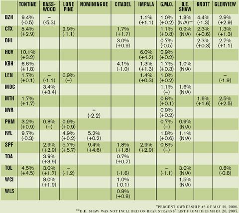 Stock buybacks essentially serve a function similar to dividends: They distribute money to shareholders so they don’t take a major hit on their investments. For an entity such as Tontine, which has significant ownership in companies such as Beazer, Centex Corp., Hovnanian Enterprises, KB Home, and The Ryland Group, that puts a lot of money back in its pockets. (See “Top Hedge Fund Equity Positions” below.)