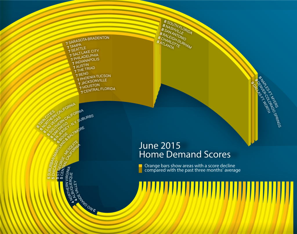 The southern region consistently has performed the best in terms of new-home sales volume in the U.S., which is reflected in demand scores for markets like Atlanta, Nashville, the Carolinas, and those in Texas.