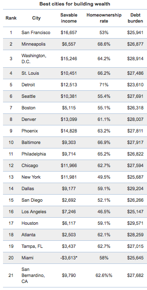 The study ranked 21 large metro areas in five categories: savable income, human capital, debt burden, home ownership and access to financial services.