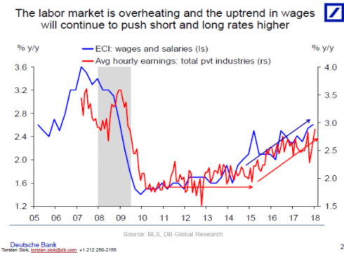 Deutsche Bank economist Torsten Slok charts similar upward pressure on interest rates as a result of momentum in wages. The good news for home builders and developers, however, is that Slok sees running room in the economy for a couple of years before a nearly inevitable downturn. He writes: