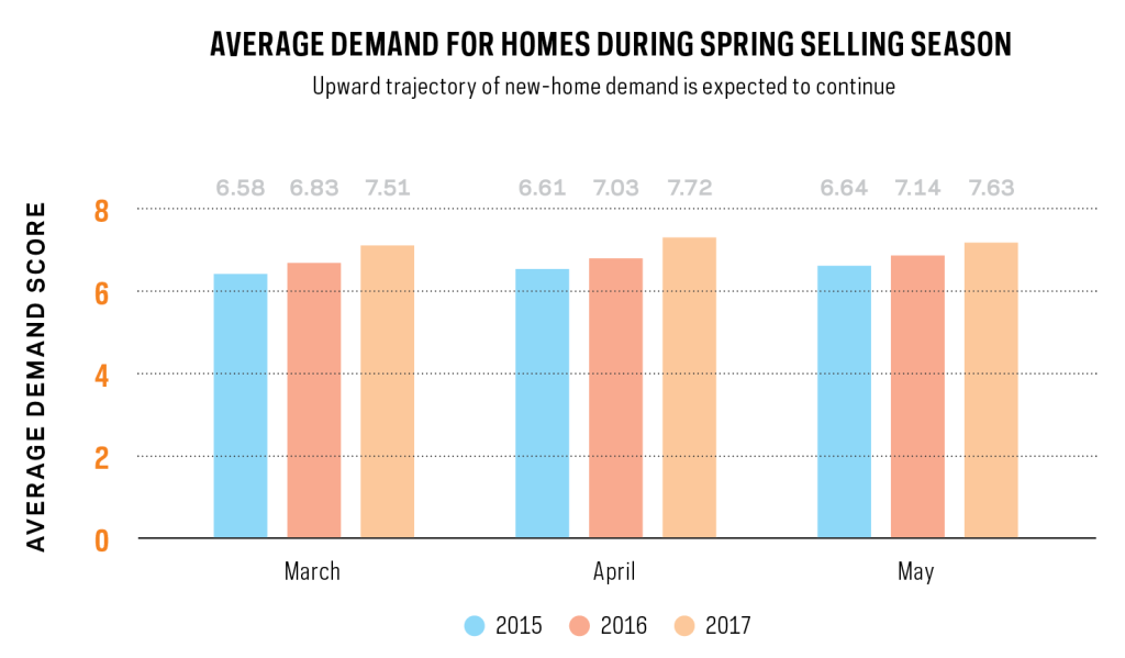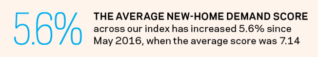 March, April, and May are the months builders reap the rewards of their hard work during the entire year. Since the start of our BUILDER-Metrostudy Demand Index in September 2014, the average score for new-home demand has been on the rise, and consistently ramps up during spring selling season. The trend continued in our latest collection from Metrostudy regional directors in 36 major housing markets, with the average demand for new homes reaching 7.63 on our 10-point scale—a 5.6% increase year over year, and a 13.6% increase from May 2014.