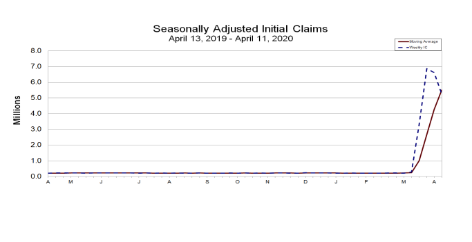 The advance number for seasonally adjusted insured unemployment during the week ending April 4 was 11,976,000, an increase of 4,530,000 from the previous week’s revised level. This marks the highest level of seasonally adjusted insured unemployment in the history of the seasonally adjusted series. The previous week’s level was revised down by 9,000 from 7,455,000 to 7,446,000. The 4-week moving average was 6,066,250, an increase of 2,568,500 from the previous week’s revised average. The previous week’s average was revised down by 2,250 from 3,500,000 to 3,497,750.