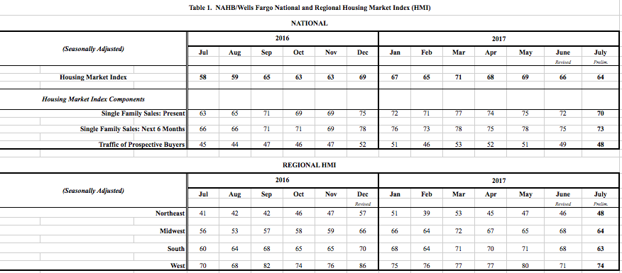 Builder confidence in the market for newly-built single-family homes slipped two points in July to a level of 64 from a downwardly revised June reading on the National Association of Home Builders/Wells Fargo Housing Market Index (HMI), NAHB said Tuesday. It was the lowest reading since November 2016.