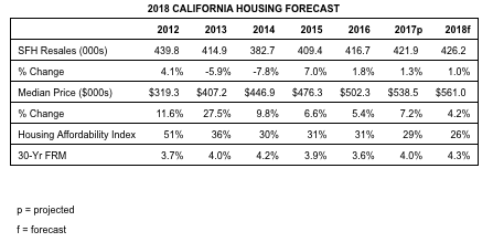 The California median home price is forecast to increase 4.2% to $561,000 in 2018, following a projected 7.2% increase in 2017 to $538,500.