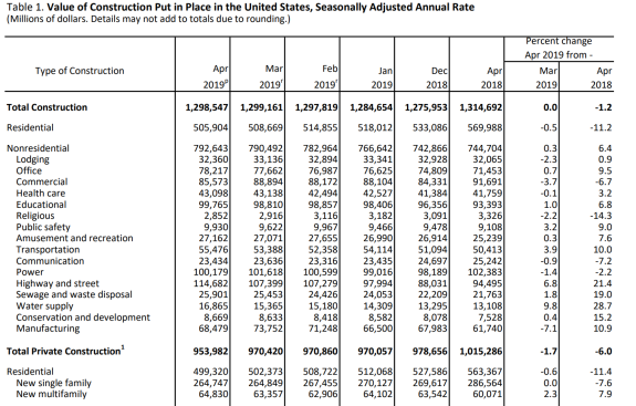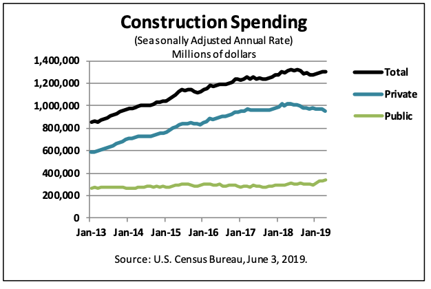 Construction spending during April 2019 was estimated at a seasonally adjusted annual rate of $1,298.5 billion, nearly the same as the revised March estimate of $1,299.2 billion, the Census Bureau reported Monday.