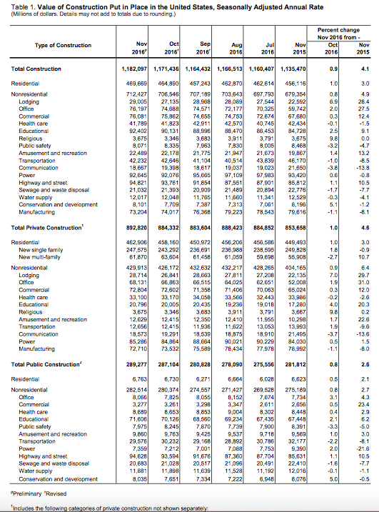 Construction spending in November 2016 was estimated at a seasonally adjusted annual rate of $1,182.1 billion, 0.9% (±1.5%)* above the revised October estimate of $1,171.4 billion, the Commerce Dept. said Tuesday. The November figure is 4.1% (±2.0%) above the November 2015 estimate of $1,135.5 billion.