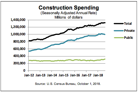 Construction spending in August rose 0.1% to a seasonally adjusted annual rate of $1,318.5 billion, 6.5% above the August 2017 estimate of $1,237.5 billion. During the first eight months of this year, construction spending amounted to $862.0 billion, 5.3% above the $818.7 billion for the same period in 2017.