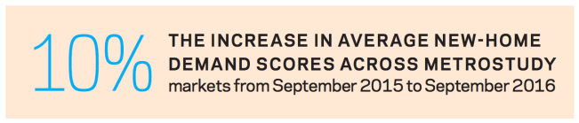 Our monthly demand index tracks builder demand for lots and buyer interest in new homes in 36 markets. The housing recovery has come a long way since September 2015; in September 2016, the average new-home demand score across all markets was 7.17 on our 10-point scale, 10.26% higher than a year prior.