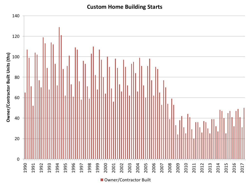 Recent Census data show that 171,000 custom homes started construction during the one-year interval spanning the third quarter of 2016 through the end of the second quarter of 2017. This is a 2.4% gain over the prior four-quarter period, which registered 167,000 starts. While growth has been fairly steady off Great Recession lows, the market share of custom homes has declined relative to speculative home building.