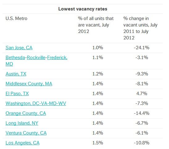 Housing vacancies in San Jose, Calif., fell by more than 24% in July 2012 compared to the same month a year ago, according to Trulia, the real-estate website. That was the single biggest year-to-year decline among the country’s top 100 metros. But San Jose’s vacancy rate, at only 1% in July, was never that high to begin with. And therein lies one of the challenges in trying to assess the ever-shifting housing supply in America’s largest urban centers.