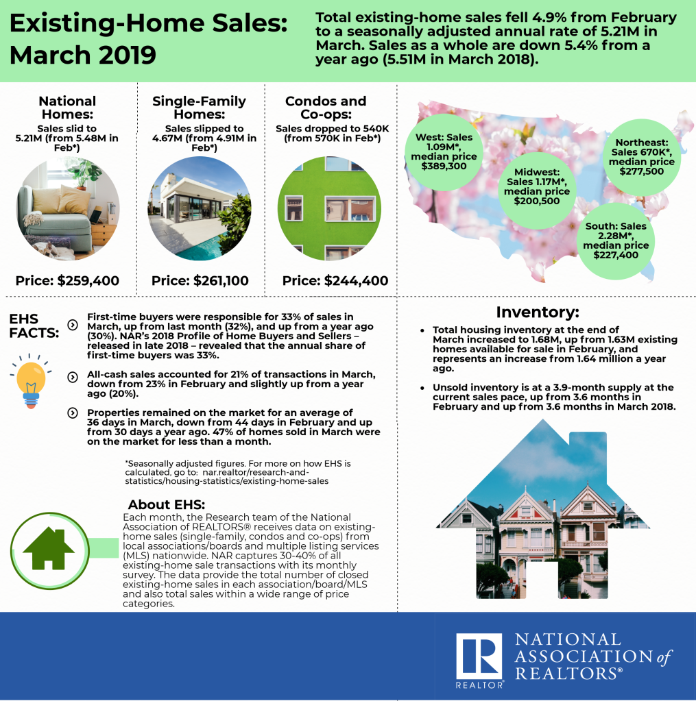 Sales were down 5.4% from a year earlier (5.51 million in March 2018). The median existing-home price for all housing types in March was $259,400, up 3.8% from March 2018 ($249,800). March’s price increase marks the 85th straight month of year-over-year gains.
