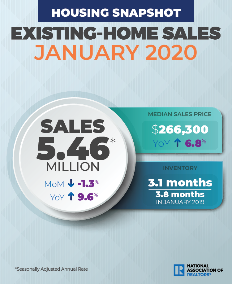 Single-family home sales sat at a seasonally-adjusted annual rate of 4.85 million in January, down from 4.91 million in December, but up 9.7% from a year ago. The median existing single-family home price was $268,600 in January 2020, up 6.9% from January 2019.