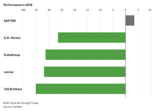 The article notes that the big national home builder shares have taken a bigger beating than the market as a whole, and what’s more, firms with more exposure to higher-end customer segments and price points are getting hit harder, as it’s thought that those companies will be first to succumb to price-point in-elasticity.