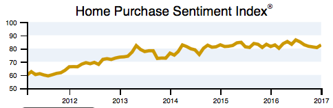 Fannie Mae’s 2017 Home Purchase Sentiment Index (HPSI) increased in January by 2 percentage points to 82.7. The HPSI is up 1.2 percentage points compared with the same time last year.