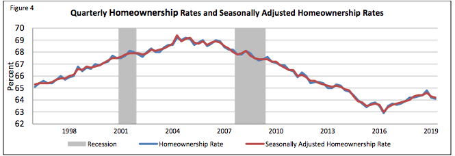 The Census Bureau reported Thursday that the national homeownership rate in the second quarter was 64.1%, not statistically different from the rate in the second quarter 2018 (64.3%) nor from the rate in the first quarter 2019 (64.2%).