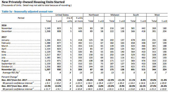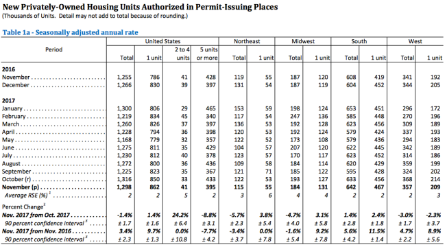 Building permits in November were at a seasonally adjusted annual rate of 1,298,000, down 1.4 percent from the revised October rate of 1,316,000 but 3.4%) above the November 2016 rate of 1,255,000. Single-family authorizations in November were at a rate of 862,000, 1.4% above the revised October figure of 850,000 and 9.7% ahead of the pace of November 2016. Authorizations of units in buildings with five units or more were at a rate of 395,000 in November, down 8.8% from October and 7.7% from a year earlier.