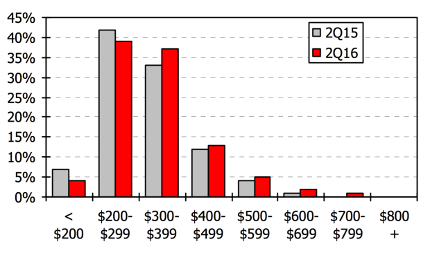 In 2Q16, the average “offer to build” base price for new Single Family detached homes throughout the region was to $339K, up 3% compared to 2Q15. Overall, pricing for new home starts has trended up in the past year, as new home starts declined YoY in price ranges $299K and below and have increased in the price ranges of $300K and above. Builders are reaching affordability limits in certain sub-markets and may be more reluctant to raise prices too aggressively in some areas.