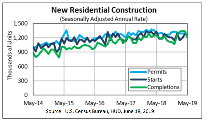 Housing completions in May were at a seasonally adjusted annual rate of 1,213,000, 9.5% below the revised April estimate of 1,340,000 and is 2.8% below the May 2018 rate of 1,248,000. Single‐family housing completions in May were at a rate of 890,000, 5.0% below the revised April rate of 937,000. The May rate for units in buildings with five units or more was 319,000.