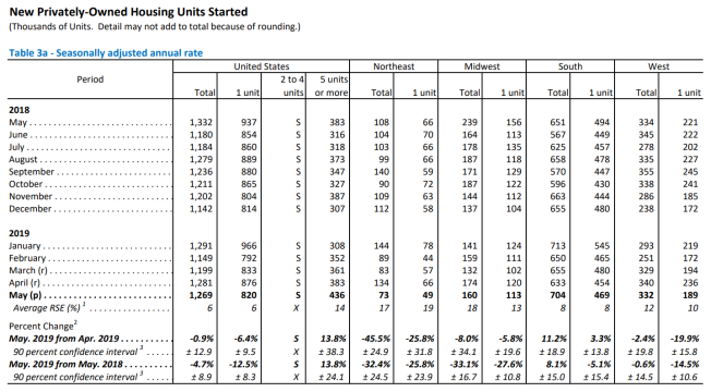 Housing starts dropped 0.9% in May from April to a seasonally adjusted annual rate of 1,269,000, 4.7% below the May 2018 rate of 1,332,000, the Census Bureau and HUD reported Tuesday.