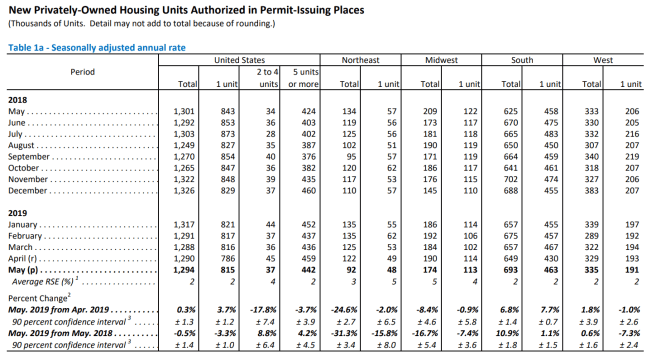 Building permits in May were at a seasonally adjusted annual rate of 1,294,000, This is 0.3% above the revised April rate of 1,290,000 but 0.5 below the May 2018 rate of 1,301,000. Single‐family authorizations in May were at a rate of 815,000, 3.7% above the revised April figure of 786,000. Authorizations of units in buildings with five units or more were at a rate of 442,000 in May, down 3.7% from April but 4.2% ahead of a year earlier.