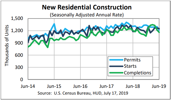 Housing completions in June were at a seasonally adjusted annual rate of 1,161,000, 4.8% below the revised May estimate of 1,220,000 and 3.7% below the June 2018 rate of 1,205,000. Single‐family housing completions in June were at a rate of 870,000, 1.8% below the revised May rate of 886,000. The June rate for units in buildings with five units or more was 283,000.