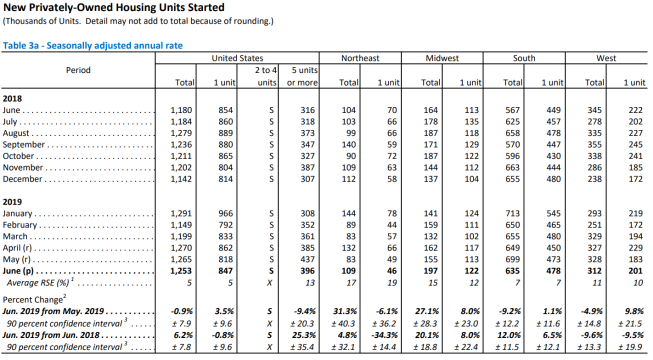 Housing starts in June fell 0.9% from May to a seasonally adjusted annual rate of 1,253,000, 6.2% ahead of June, 2018, the Commerce Department reported Wednesday. Single‐family housing starts in June were at a rate of 847,000, 3.5% above the revised May figure of 818,000. The June rate for units in buildings with five units or more was 396,000.