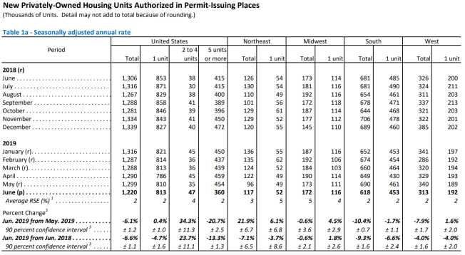 Building permits fell 6.1% in June from May and were at a seasonally adjusted annual rate of 1,220,000, 6.6% below the June 2018 rate of 1,306,000. Single‐family authorizations in June were at a rate of 813,000, 0.4% above the revised May figure of 810,000. Authorizations of units in buildings with five units or more were at a rate of 360,000 in June.