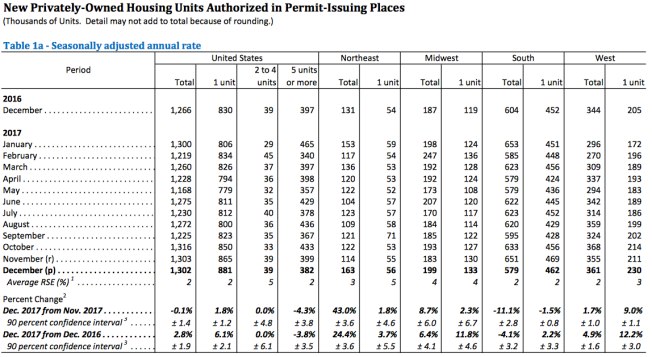 Building permits in December were at a seasonally adjusted annual rate of 1,302,000, 0.1 percent% below the revised November rate of 1,303,000 but 2.8% above the December 2016 rate of 1,266,000. Single-family authorizations in December were at a rate of 881,000, 1.8% above the revised November figure of 865,000.