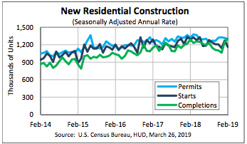 Housing completions in February were at a seasonally adjusted annual rate of 1,303,000, 4.5% above the revised January estimate of 1,247,000 and is 1.1% above the February 2018 rate of 1,289,000. Single‐family housing completions in February were at a rate of 816,000, 10.0% below the revised January rate of 907,000. The February rate for units in buildings with five units or more was 473,000.