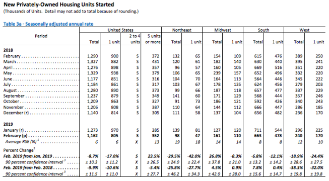 Housing starts in February were down 8.7% from January to a seasonally adjusted annual rate of 1,162,000, 9.9% below the February 2018 rate of 1,290,000, the Census Bureau and the Department of Housing and Urban Development jointly announced Tuesday morning.