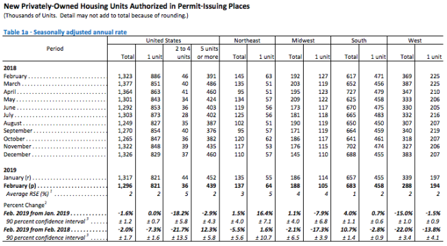 Building permits in February were at a seasonally adjusted annual rate of 1,296,000, 1.6% below the revised January rate of 1,317,000 and 2.0% below the February 2018 rate of 1,323,000. Single‐family authorizations in February were at a rate of 821,000, flat with the revised January figure of 821,000. Authorizations of units in buildings with five units or more were at a rate of 439,000 in February, down 2.9% from January but up 12.3% from a year earlier.