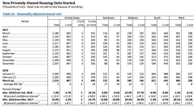 Housing starts blew through economist estimates in March, posting a seasonally adjusted annual rate of 1,319,000, 1.9% above the revised February estimate of 1,295,000 and is 10.9% above the March 2017 rate of 1,189,000, the Commerce Department reported Tuesday. Econmists were looking for a rate of 1.264 million.