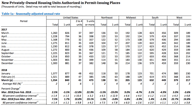 Building permits in March were at a seasonally adjusted annual rate of 1,354,000, 2.5% above the revised February rate of 1,321,000 and 7.5% above the March 2017 rate of 1,260,000. Single-family authorizations in March were at a rate of 840,000, this is 5.5% below the revised February figure of 889,000. Authorizations of units in buildings with five units or more were at a rate of 473,000 in March, up 22.9% sequentially and 19.1% from March 2017.