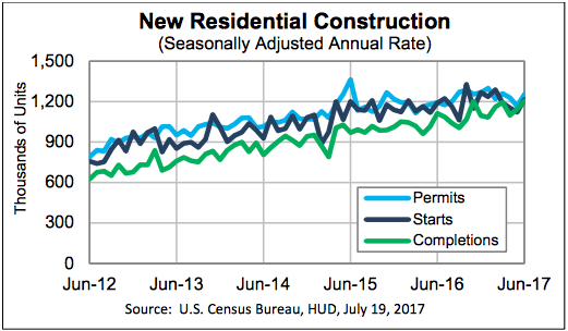 Housing starts in June came in 8.3% ahead of May at a seasonally adjusted annual rate of 1,215,000, 2.1% above the June 2016 rate of 1,190,000, the Census Bureau reported Wednesday. Single-family starts were up 6.3% to a rate of 849,000, 10.3% ahead of last June.