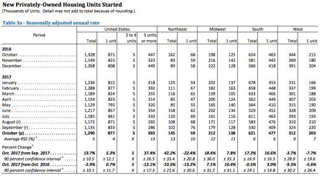 Housing starts in October were at a seasonally adjusted annual rate of 1,290,000, 13.7% above the revised September estimate of 1,135,000 but 2.9% below the October 2016 rate of 1,328,000, the Commerce Department said Friday.